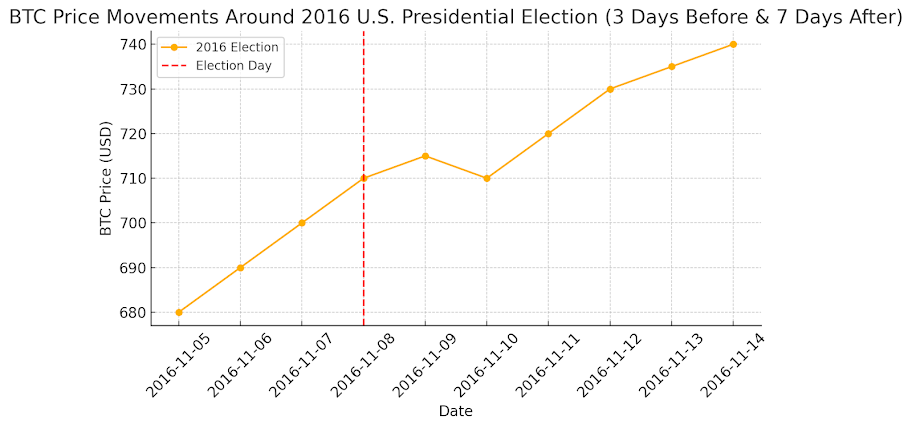 - 選挙後の動き:選挙日を過ぎてから価格が急上昇し、約1週間後には15,400ドルまで達しました。